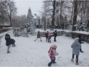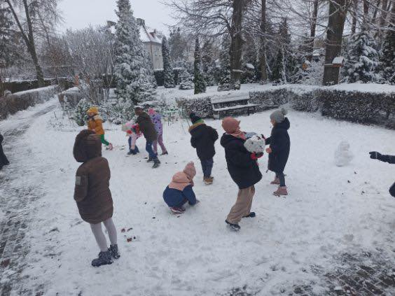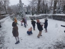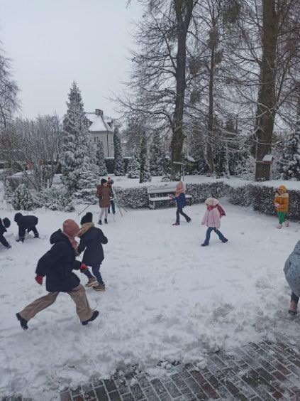 Lekcja wychowania fizycznego na świeżym powietrzu. Zima zawitała w nasze progi. Uczniowie klas pierwszej i drugiej powitali ją bitwą na kule śniegowe. Zabawa była przednia a jednocześnie jedna z lekcji wf.