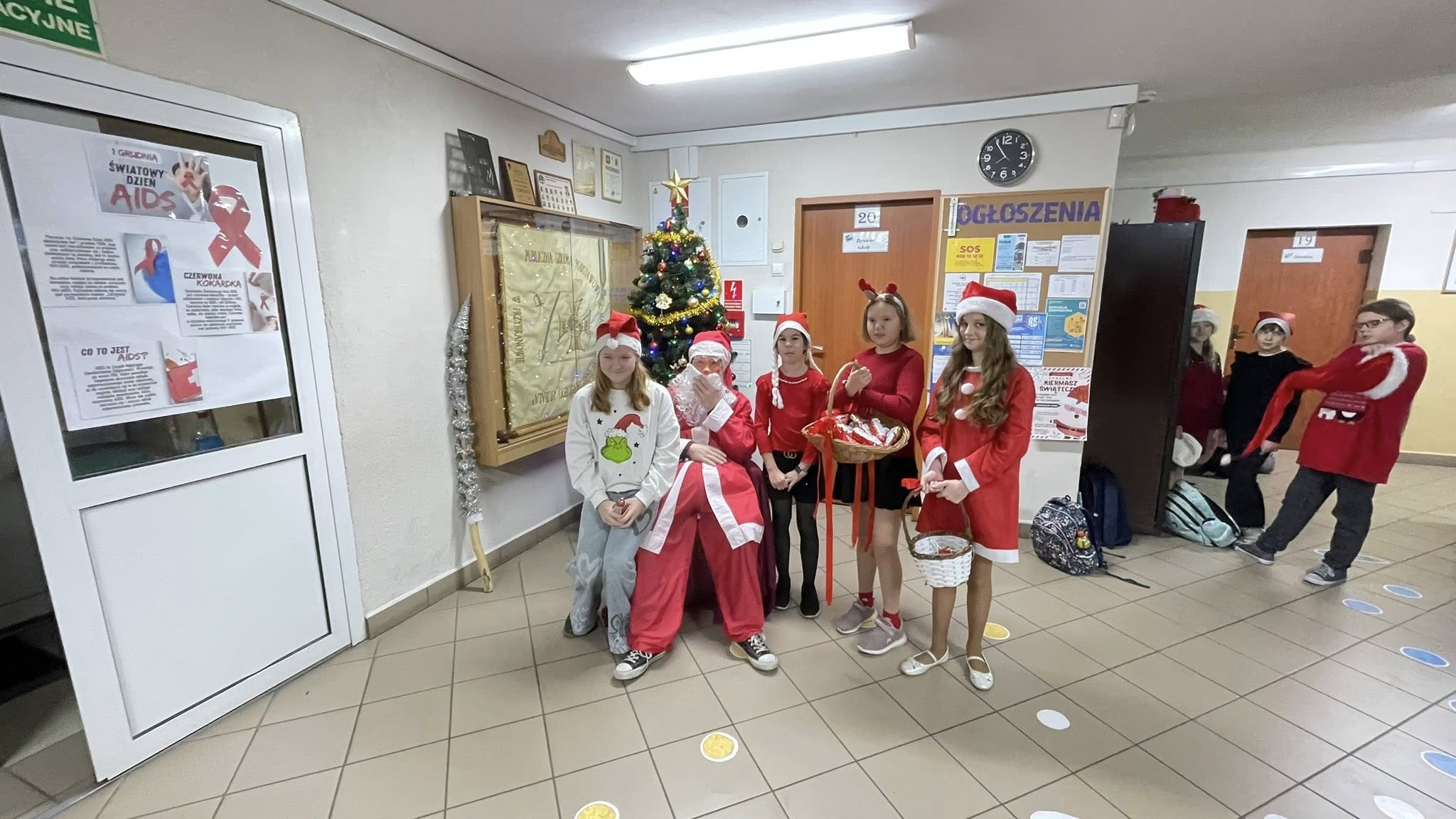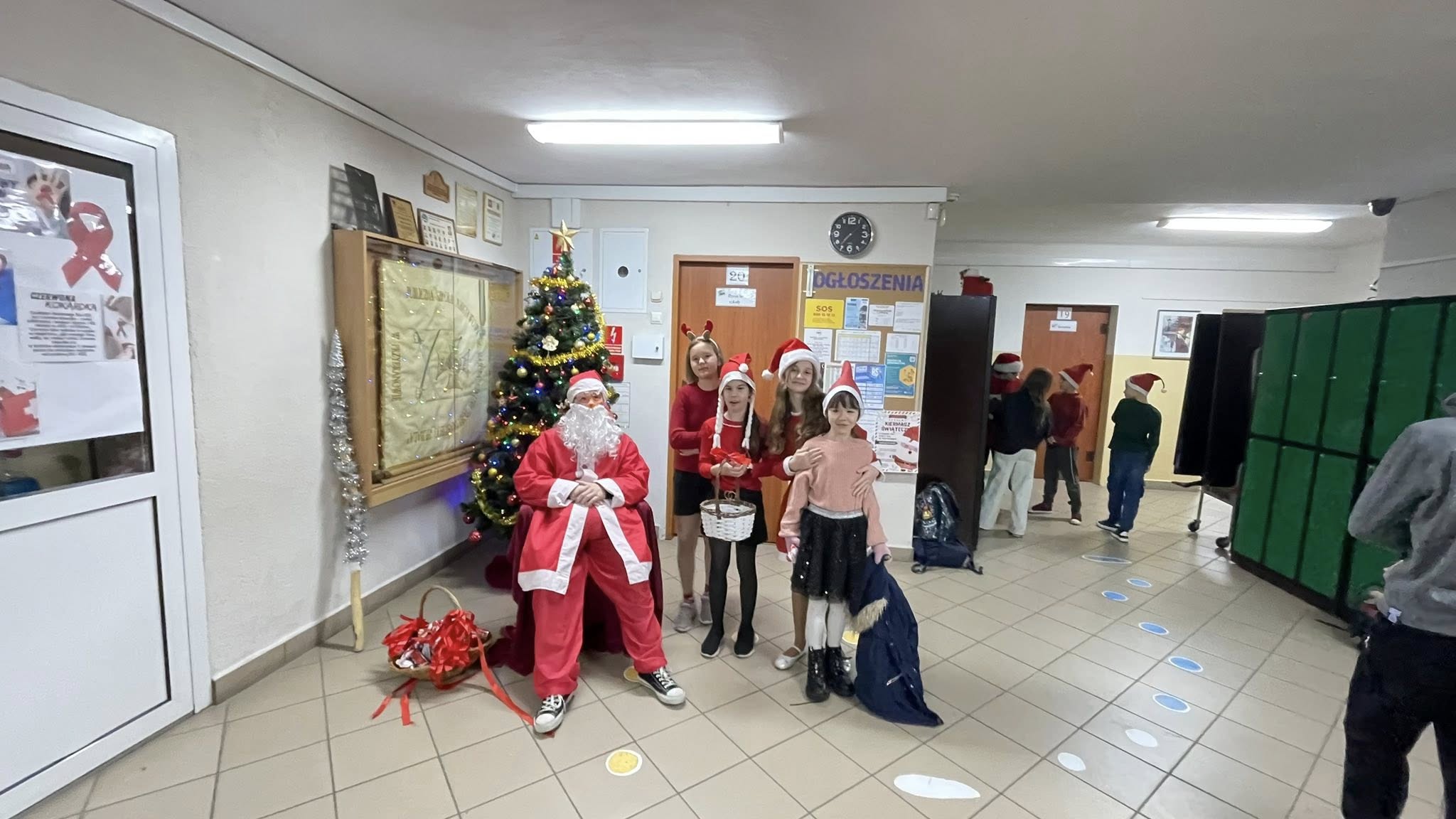 Tuż przy wejściu czekał na dzieci Święty Mikołaj, który każdego witającego się z nim ucznia obdarował słodkim upominkiem.