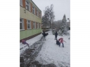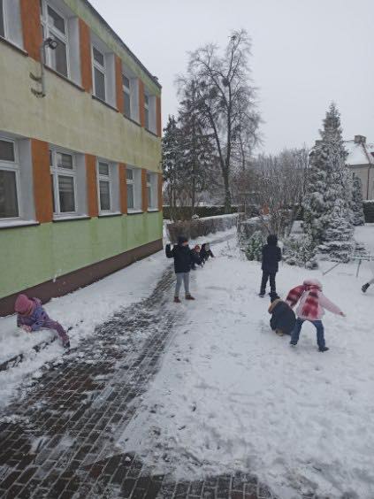 Lekcja wychowania fizycznego na świeżym powietrzu. Zima zawitała w nasze progi. Uczniowie klas pierwszej i drugiej powitali ją bitwą na kule śniegowe. Zabawa była przednia a jednocześnie jedna z lekcji wf.