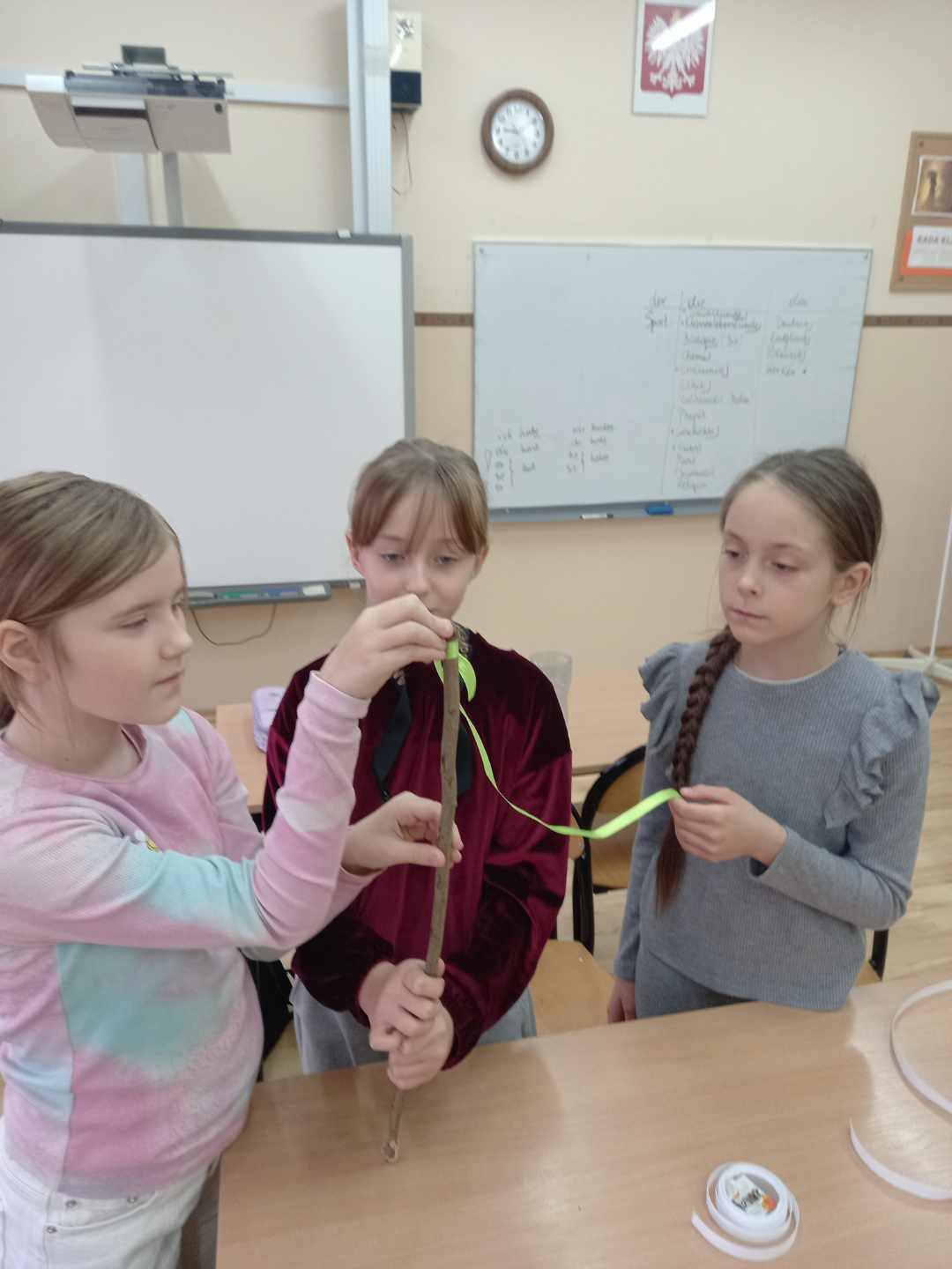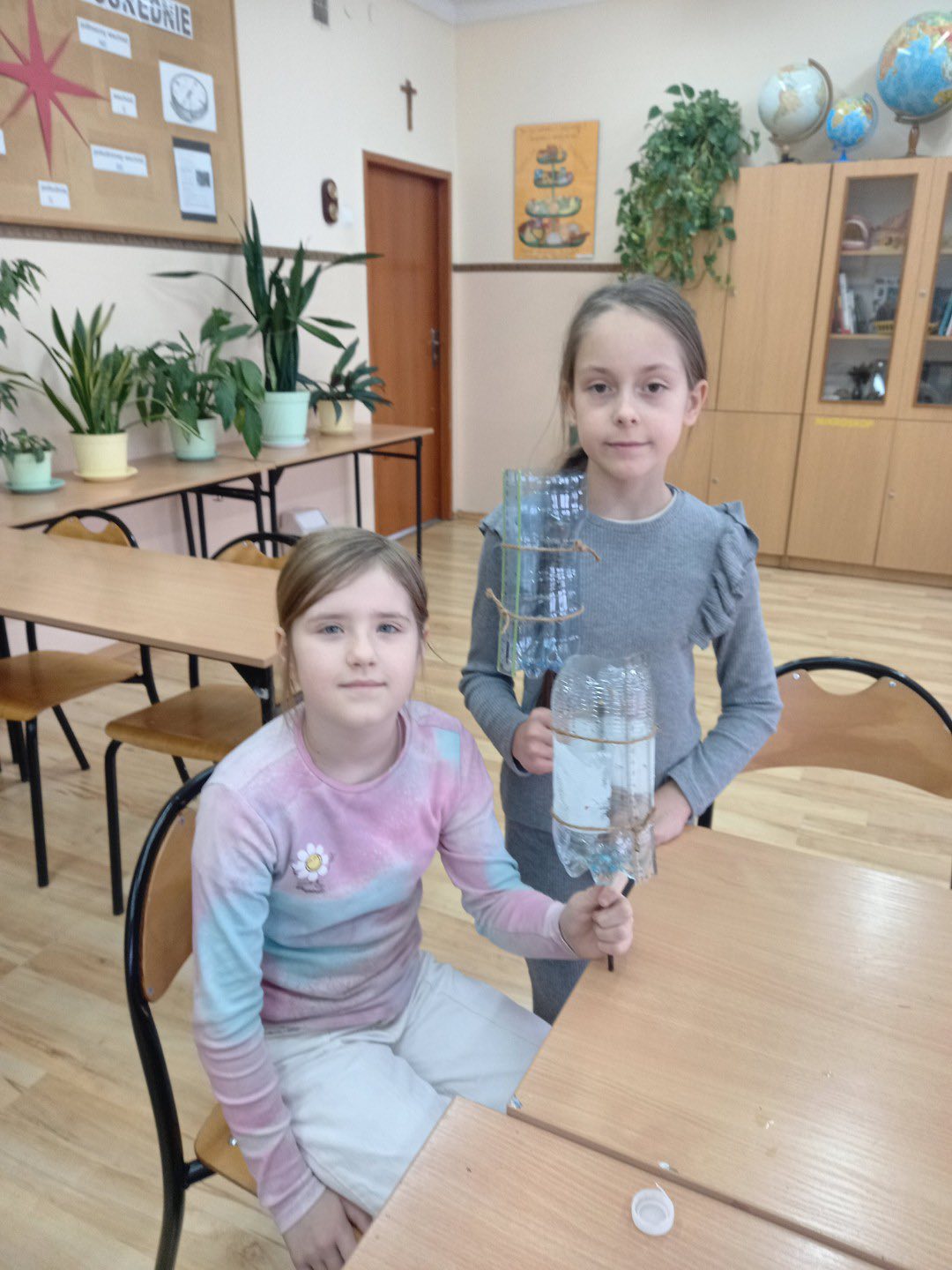 Uczniowie klasy IV na zajęciach koła przyrodniczego wykonali deszczomierze – przyrządy do pomiaru wielkości opadów oraz wiatromierze – przyrządy badające![]()