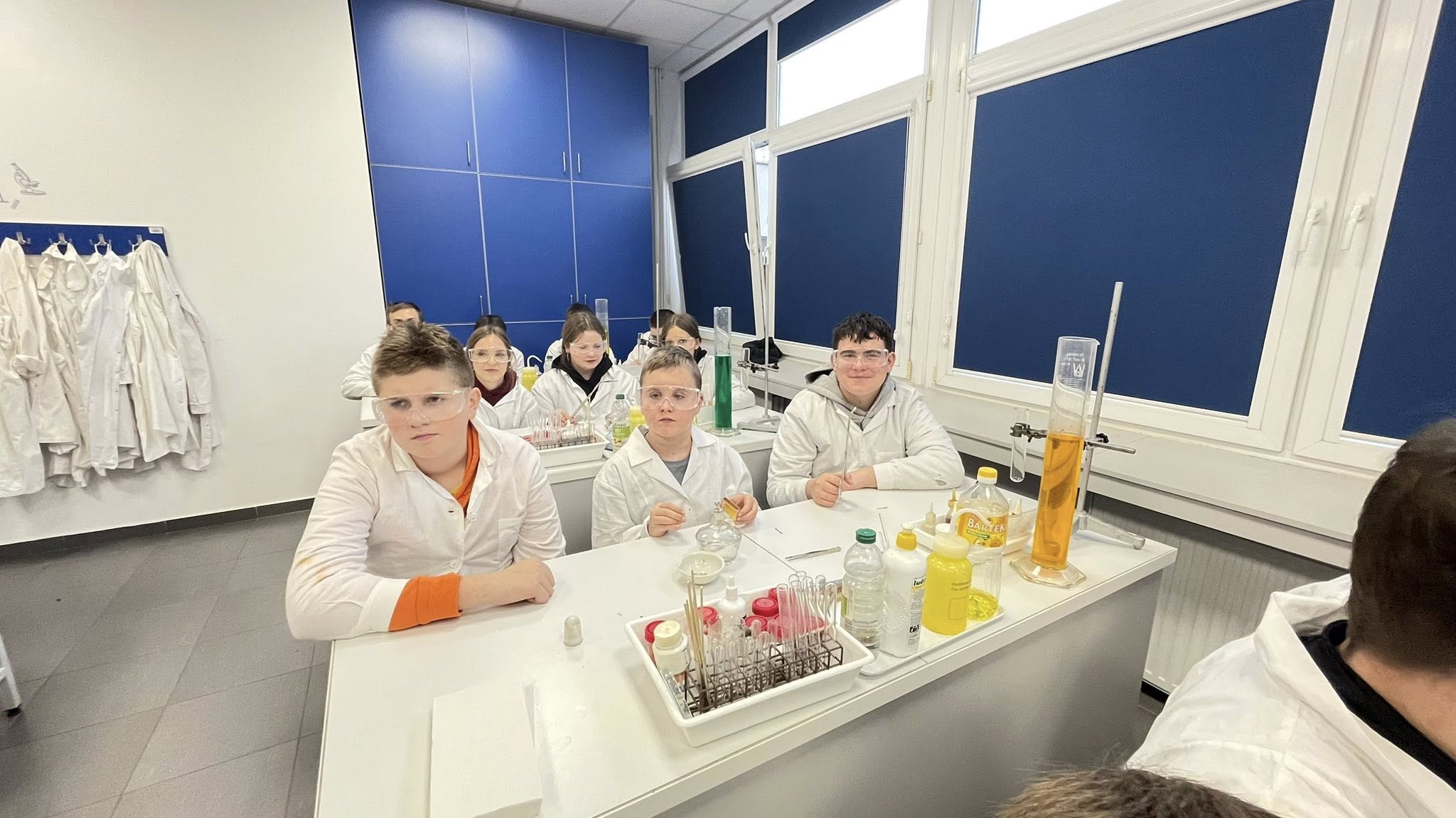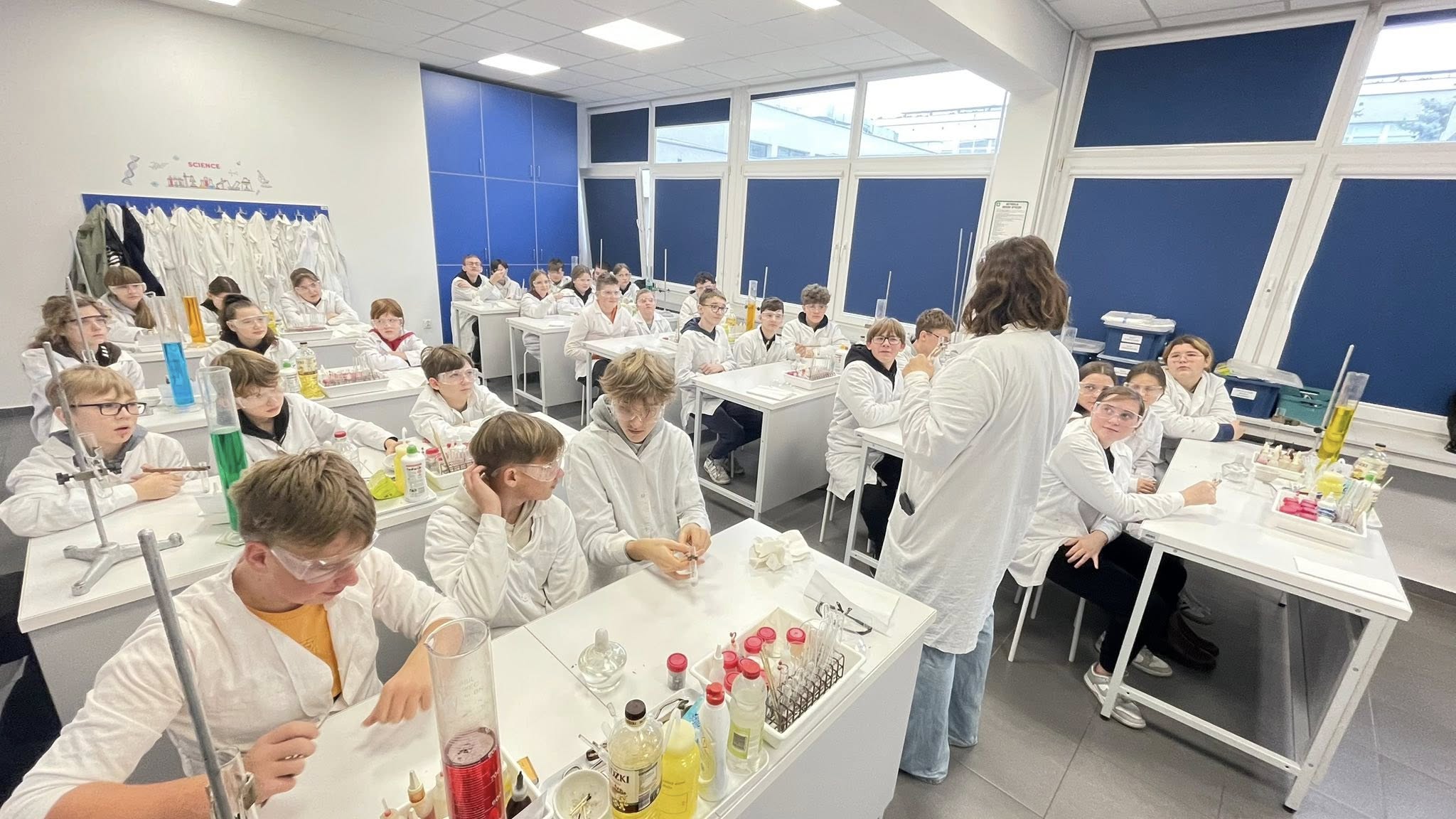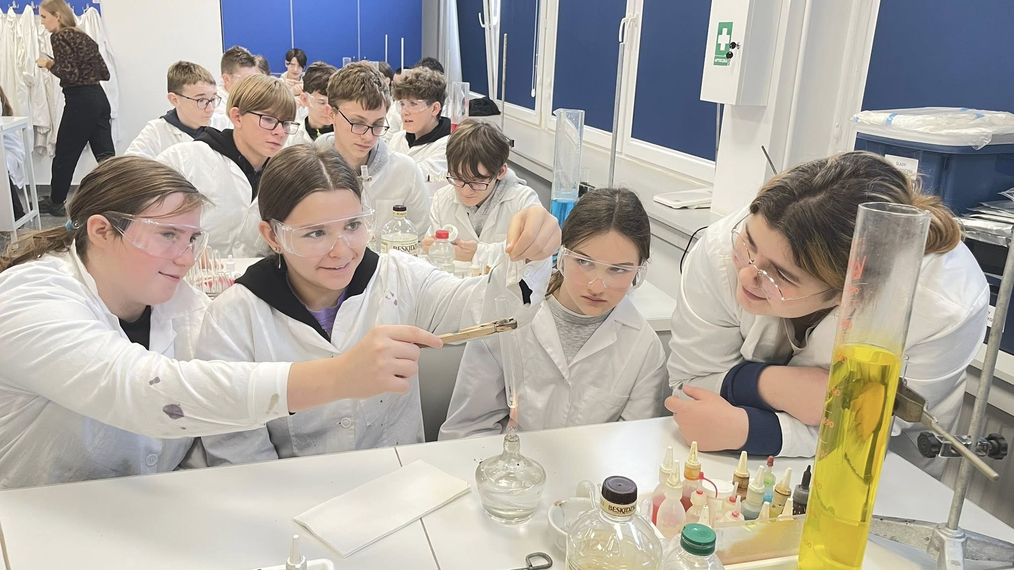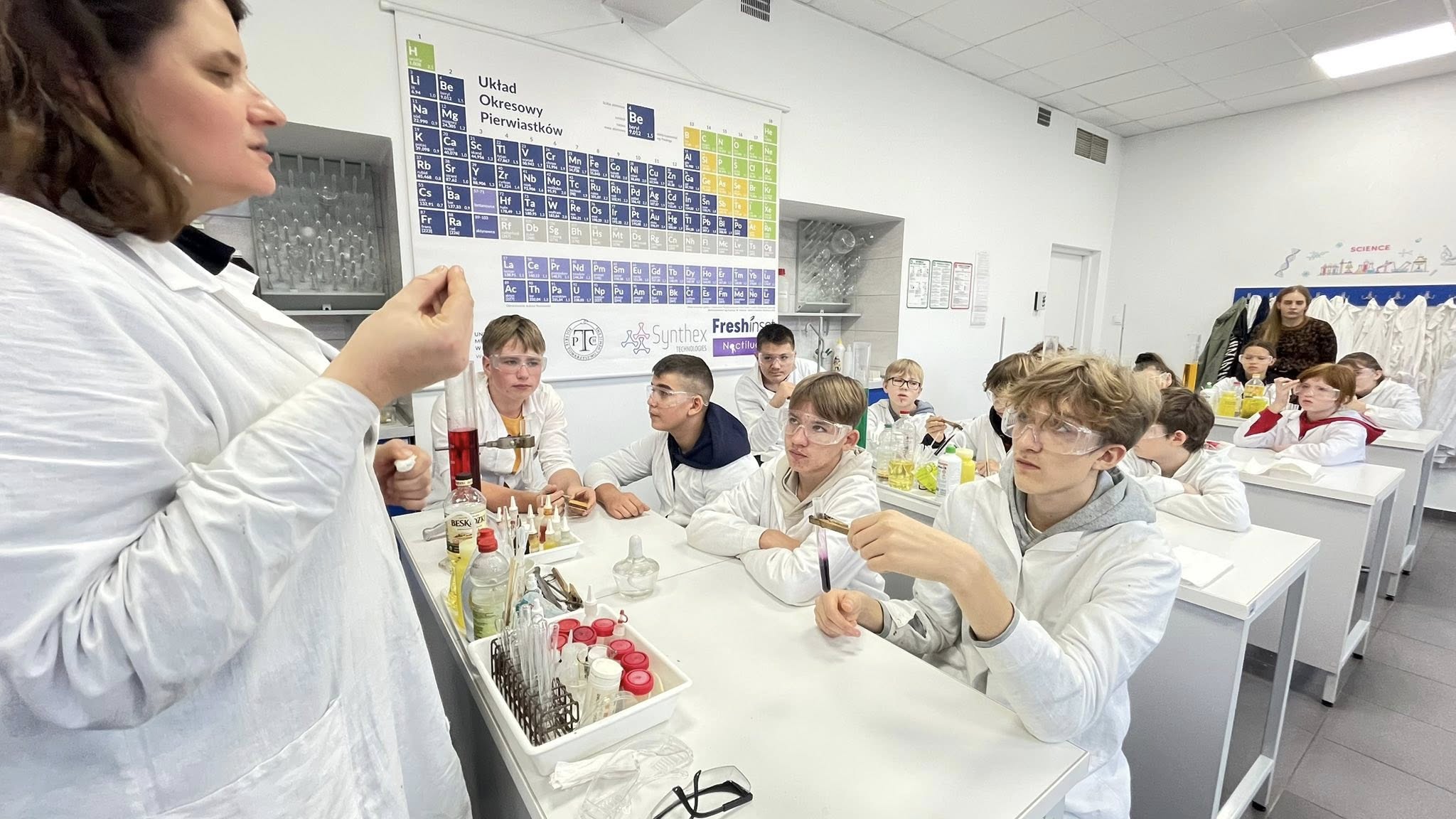 Uczniowie klas 6–8 wybrali się dziś do Toruńskiego Wydziału Chemii UMK, żeby przekonać się, jak wygląda życie prawdziwego chemika. I wiecie co? To nie tylko białe fartuchy i probówki – to czysta magia nauki (czasem dosłownie, bo coś syczało, parowało i zmieniało kolor