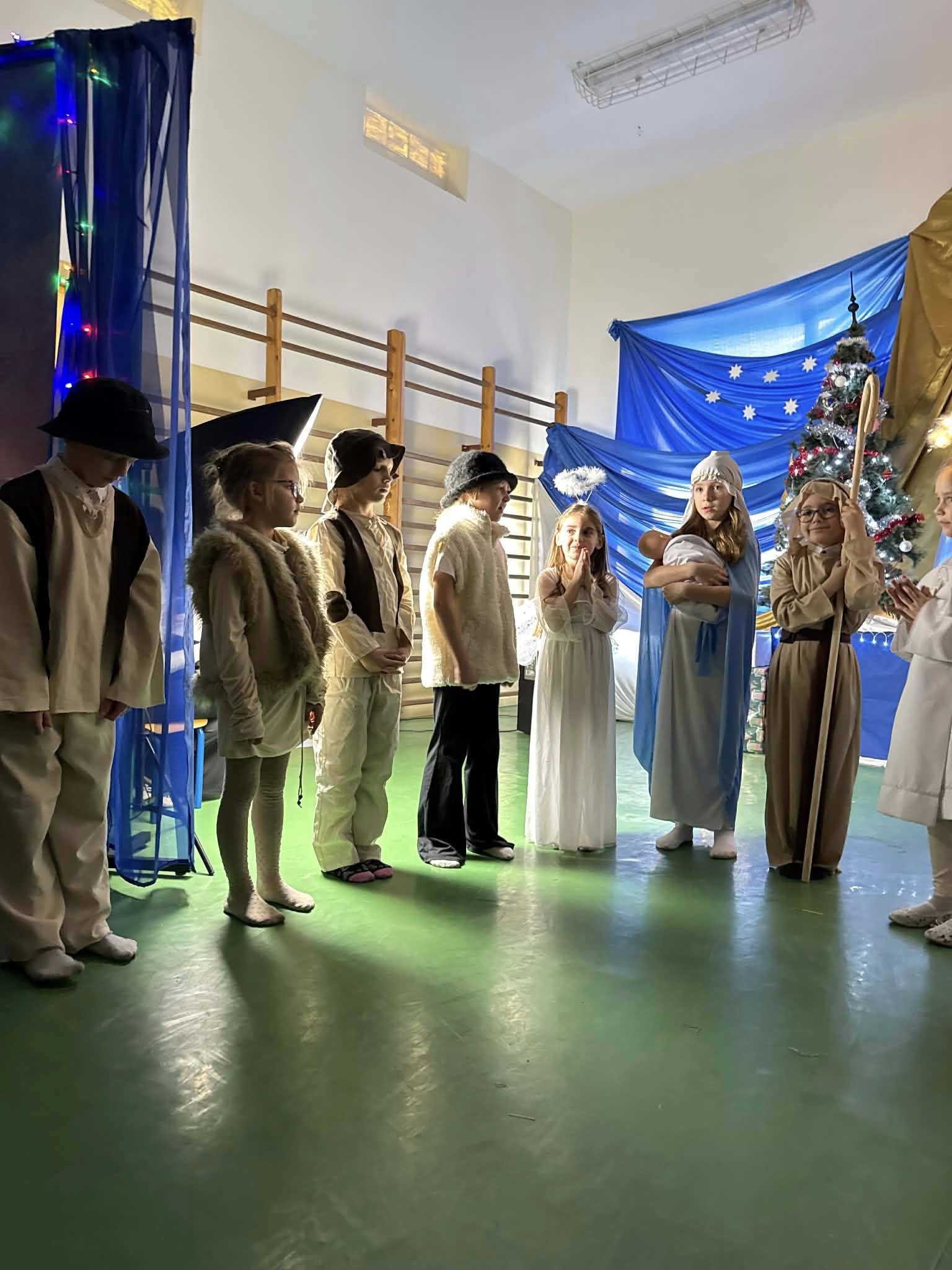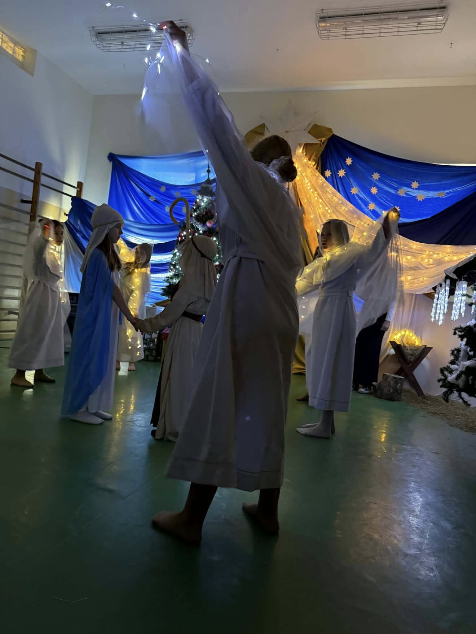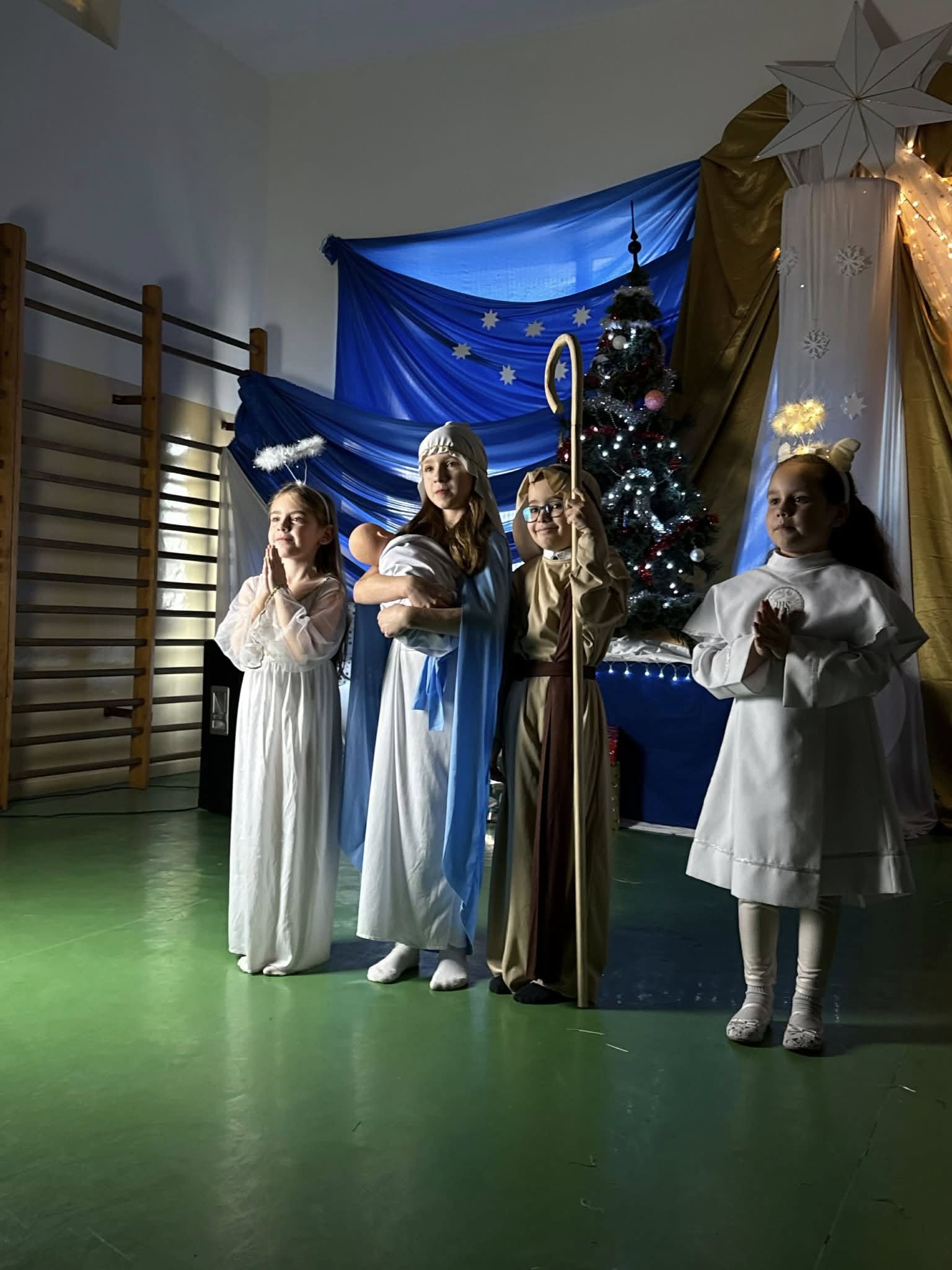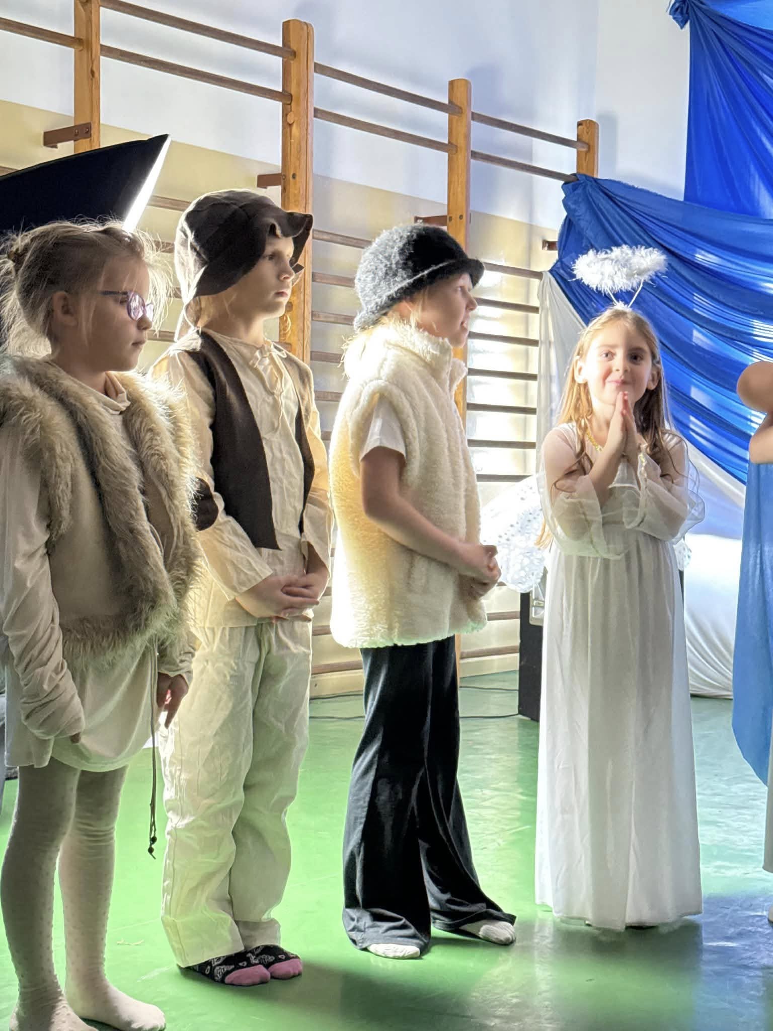 Szczególne wzruszenie wzbudził piękny debiut naszych najmłodszych uczniów. Z odwagą, skupieniem i dziecięcą szczerością stanęli na scenie, udowadniając, że nawet najmniejsze głosy potrafią opowiedzieć wielką historię. Były anioły, pasterze, kolędy i cisza na sali – ta wyjątkowa, gdy serca słuchają uważniej niż uszy.
