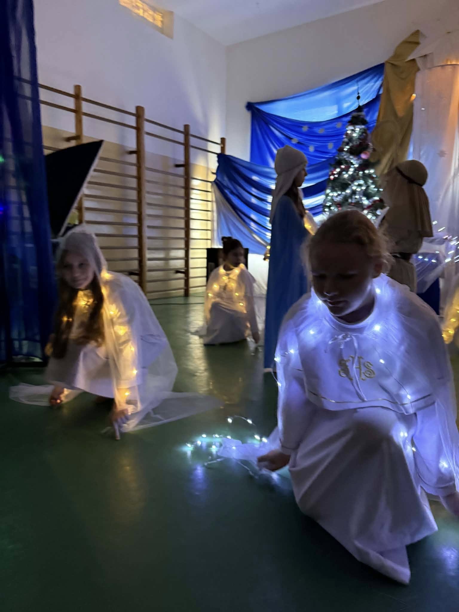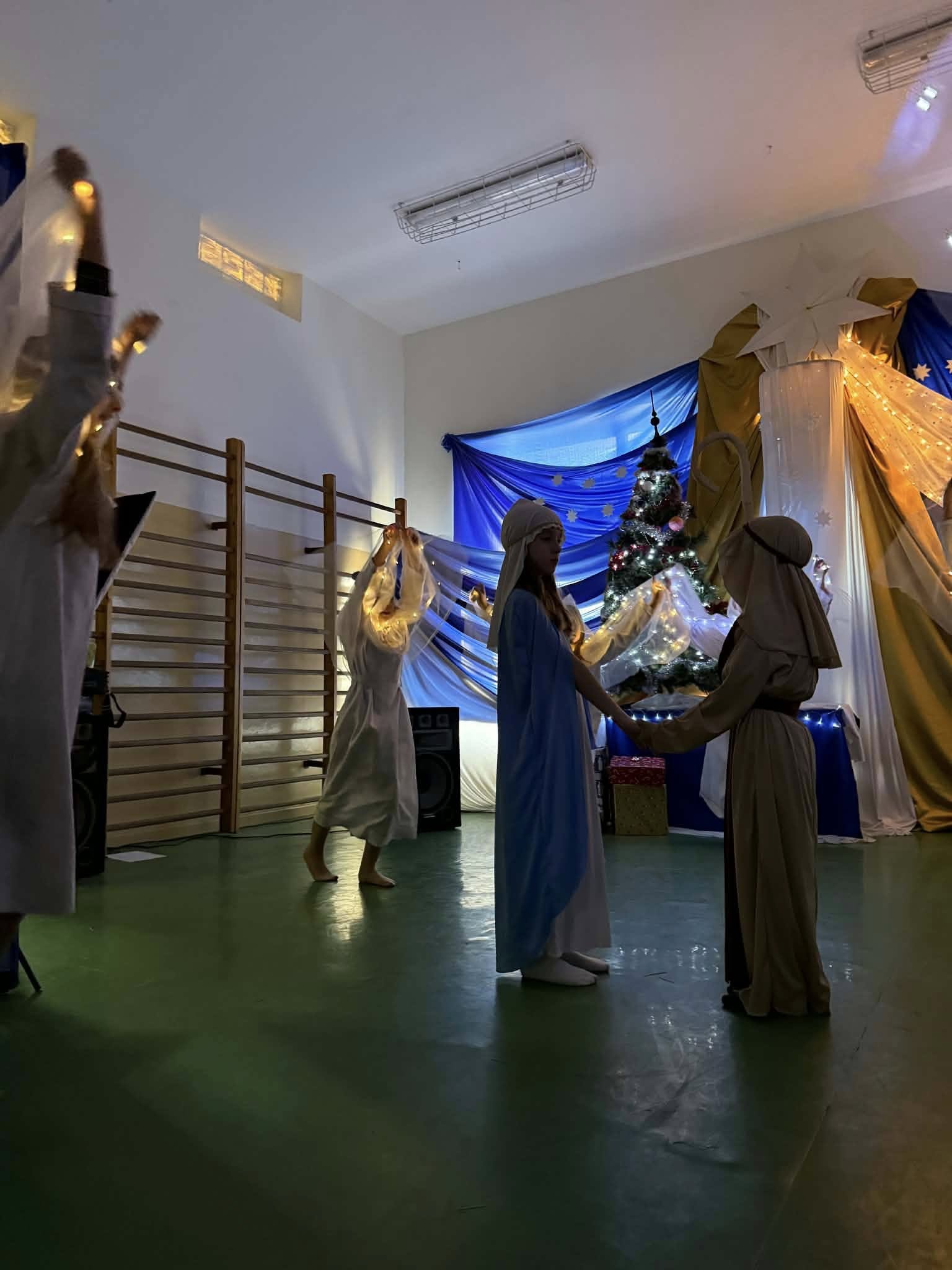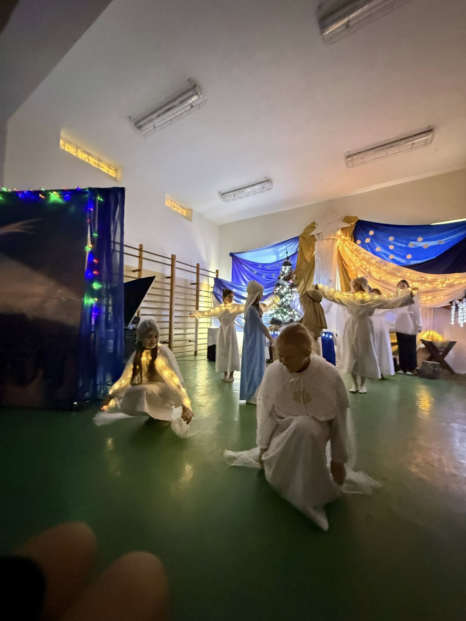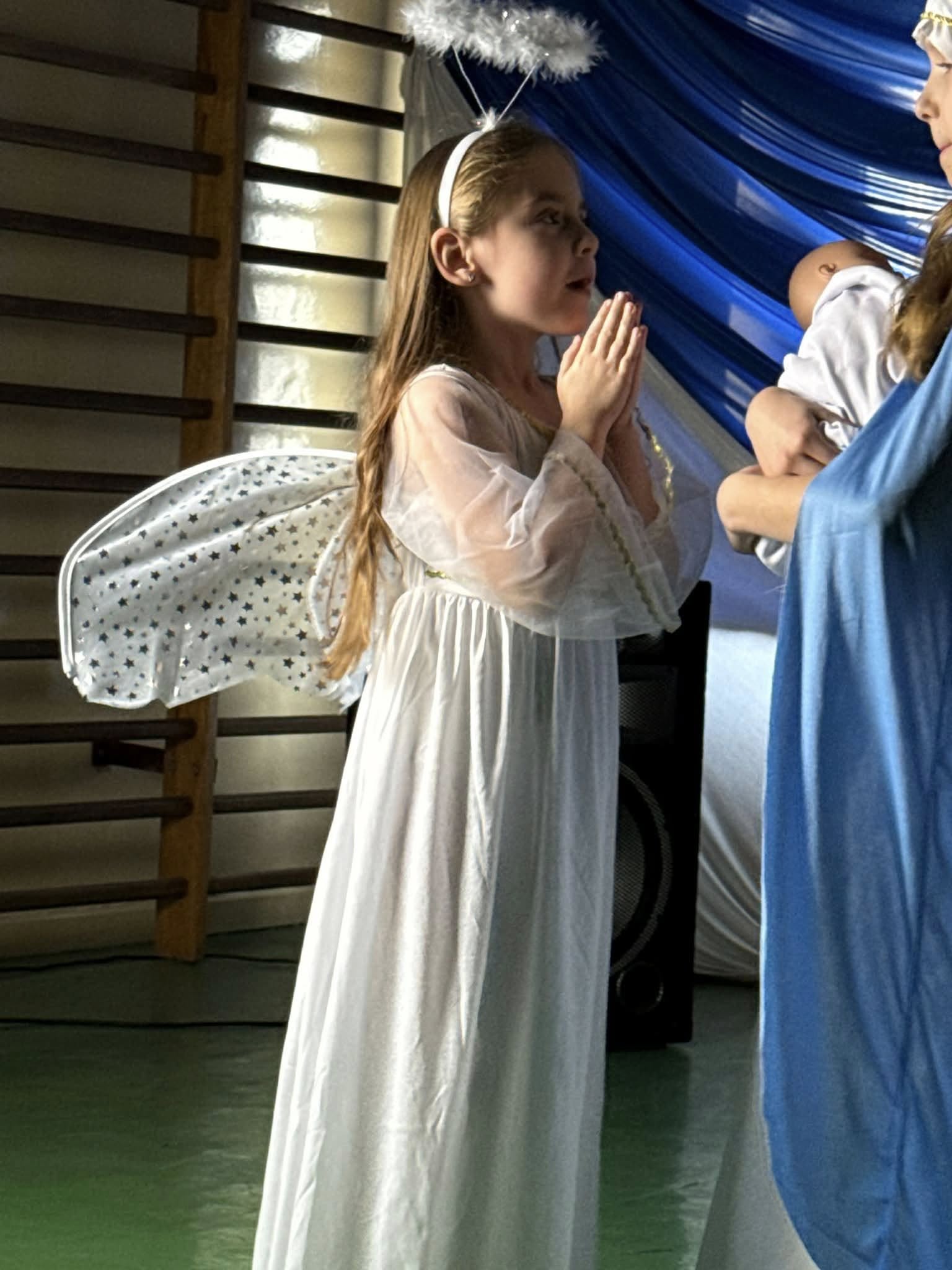 Szczególne wzruszenie wzbudził piękny debiut naszych najmłodszych uczniów. Z odwagą, skupieniem i dziecięcą szczerością stanęli na scenie, udowadniając, że nawet najmniejsze głosy potrafią opowiedzieć wielką historię. Były anioły, pasterze, kolędy i cisza na sali – ta wyjątkowa, gdy serca słuchają uważniej niż uszy.