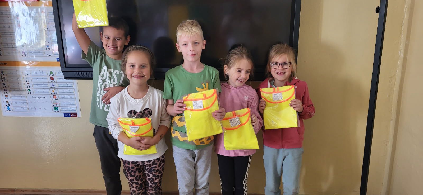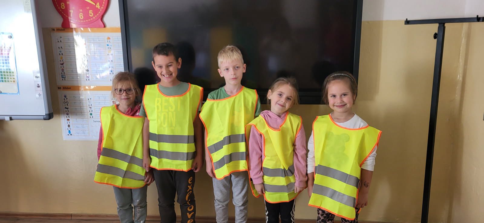 Nasi najmłodsi uczniowie – pierwszoklasiści – otrzymali od policji kamizelki odblaskowe. Dzięki nim dzieci będą lepiej widoczni na drodze, szczególnie jesienią i zimą, kiedy szybciej zapada zmrok.